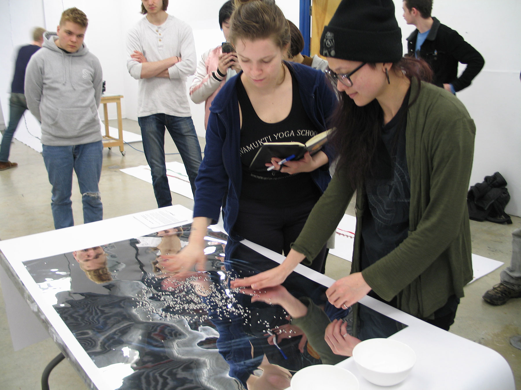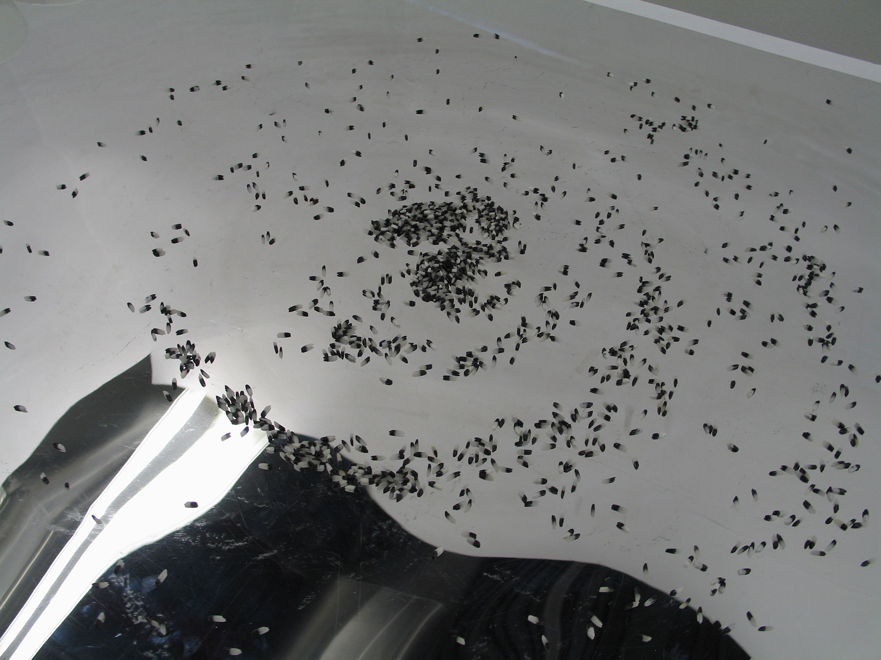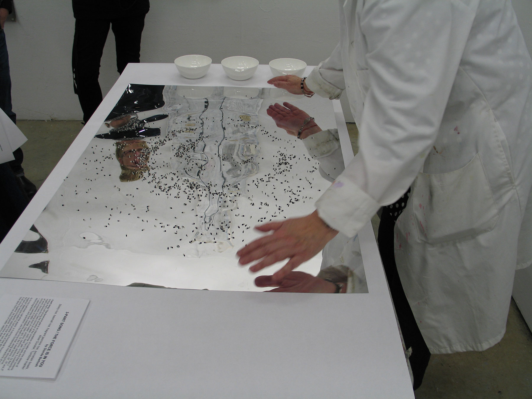 3-part Song / The Force is in You is a participatory art project that interprets matter and the release of energy that’s still driving the formation of the universe. The 3 bowls and their contents might symbolize the 3 basic forms of matter: solid, liquid, gas. Or the 3 constituents of an atom, the basic building block of matter: protons, neutrons, electrons. Or the 3 intrinsic properties of matter: charge, mass, spin. Or the 3 weak bosons, W+, W- and Z0 — elementary particles that mediate the weak force that, along with strong force, electromagnetism and gravitation, are the known fundamental interactions of nature.
