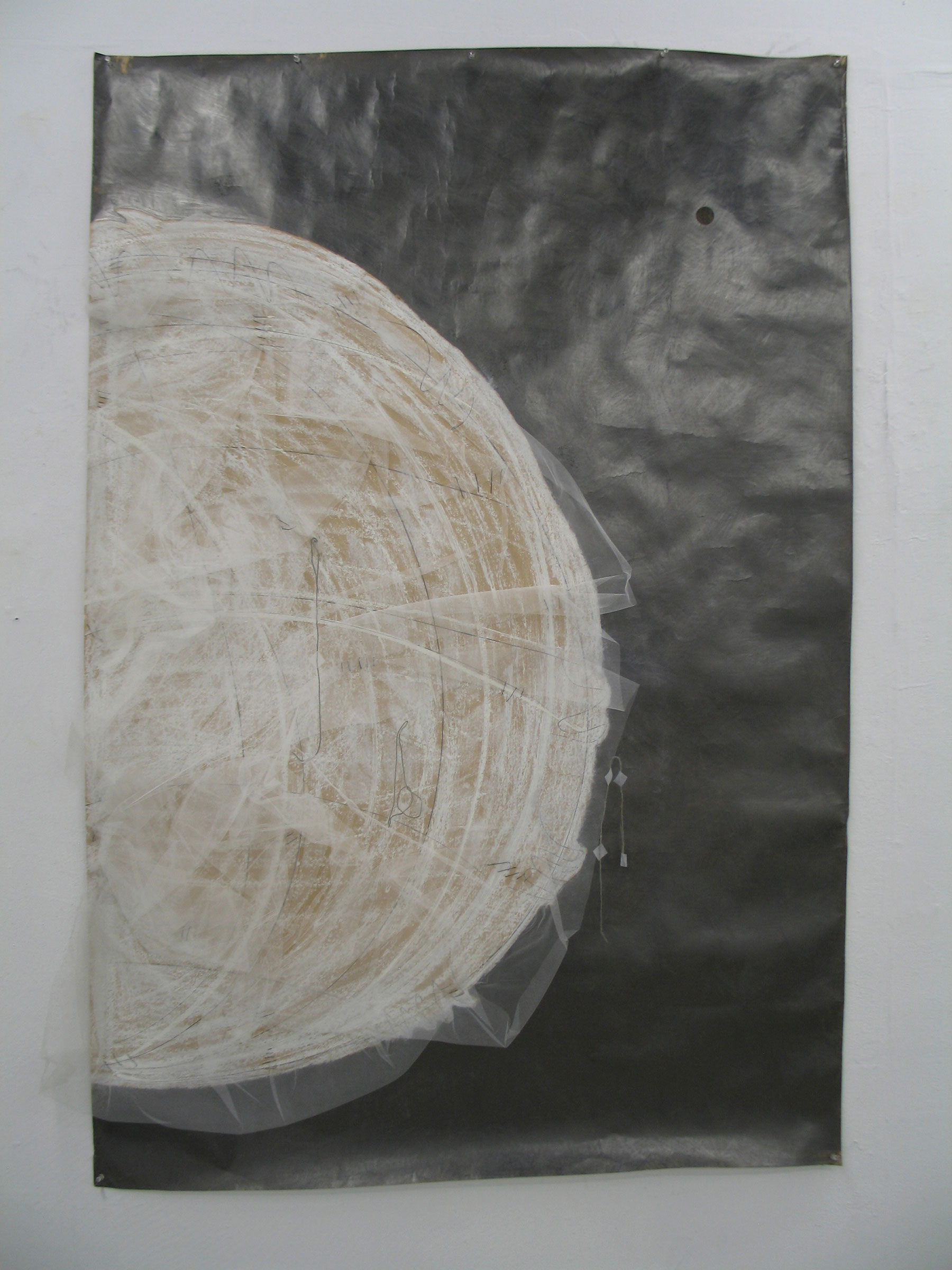 To start, I made a 3-foot by 5-foot drawing. Although it was not necessarily made for people who are visually impaired, it contains various tactile elements. The dark ground of organized geometric marks made with graphite sets off a white semicircular area made with chalk pastel and complicated with layered with mesh, bits of thread and metal and tape. The semicircle was determined by the circumference of my own reach.
